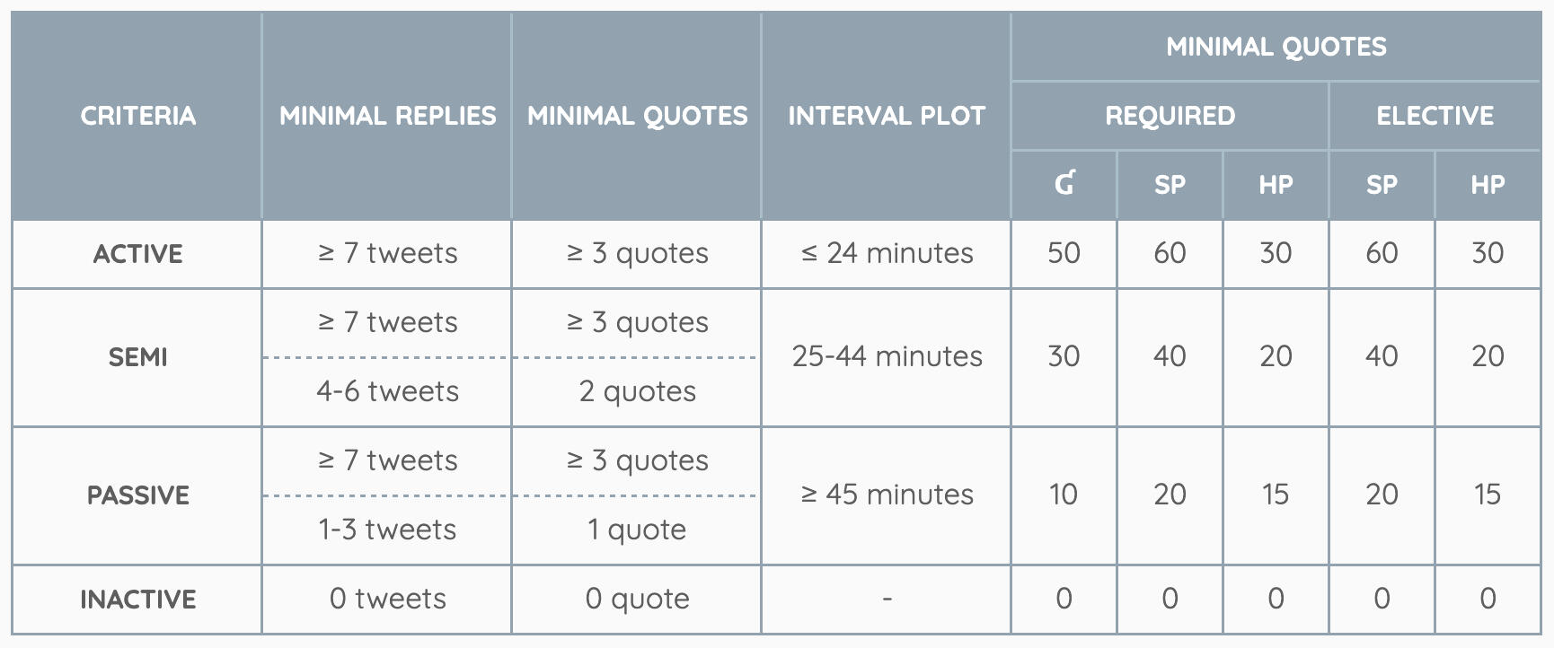 Active (Full Reward): Menghadiri kelas dengan menulis narasi sebanyak 7 kiriman atau lebih, mengutip ulang narasi pengajar sebanyak 3 atau lebih, dan narasi tidak lebih dari 24 menit. Ini juga berlaku bagi yang telah melakukan izin keluar kelas dan sudah melakukan keseluruhan kriteria pada poin ini. Untuk bisa mendapatkan kategori ini, seorang murid wajib memulai narasinya sebelum pukul 06.30 p.m.